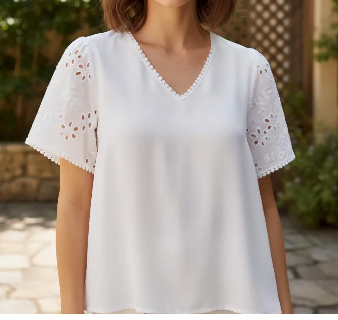 Blusa de poplin con manga brodery y motitas en el escote en V.