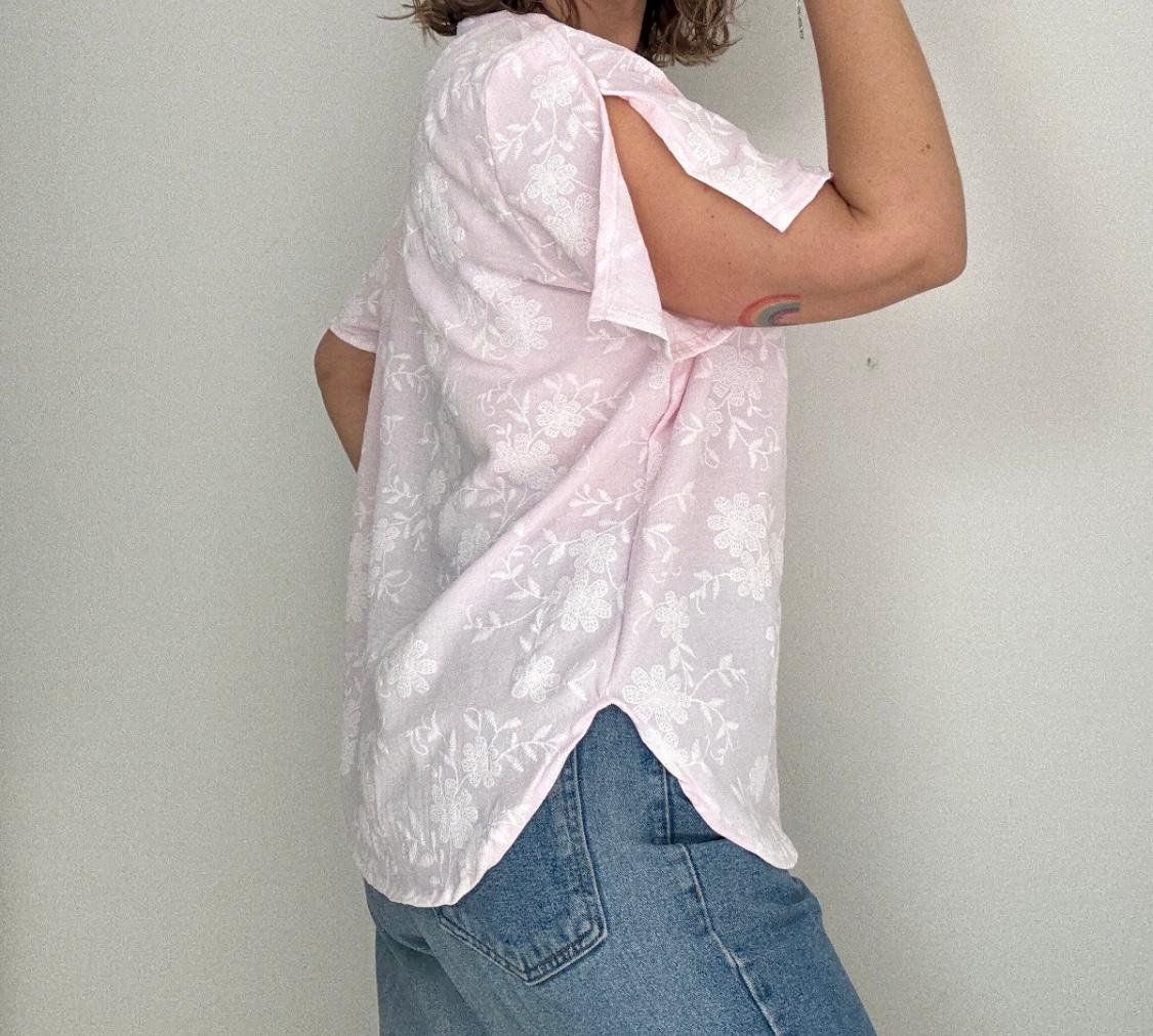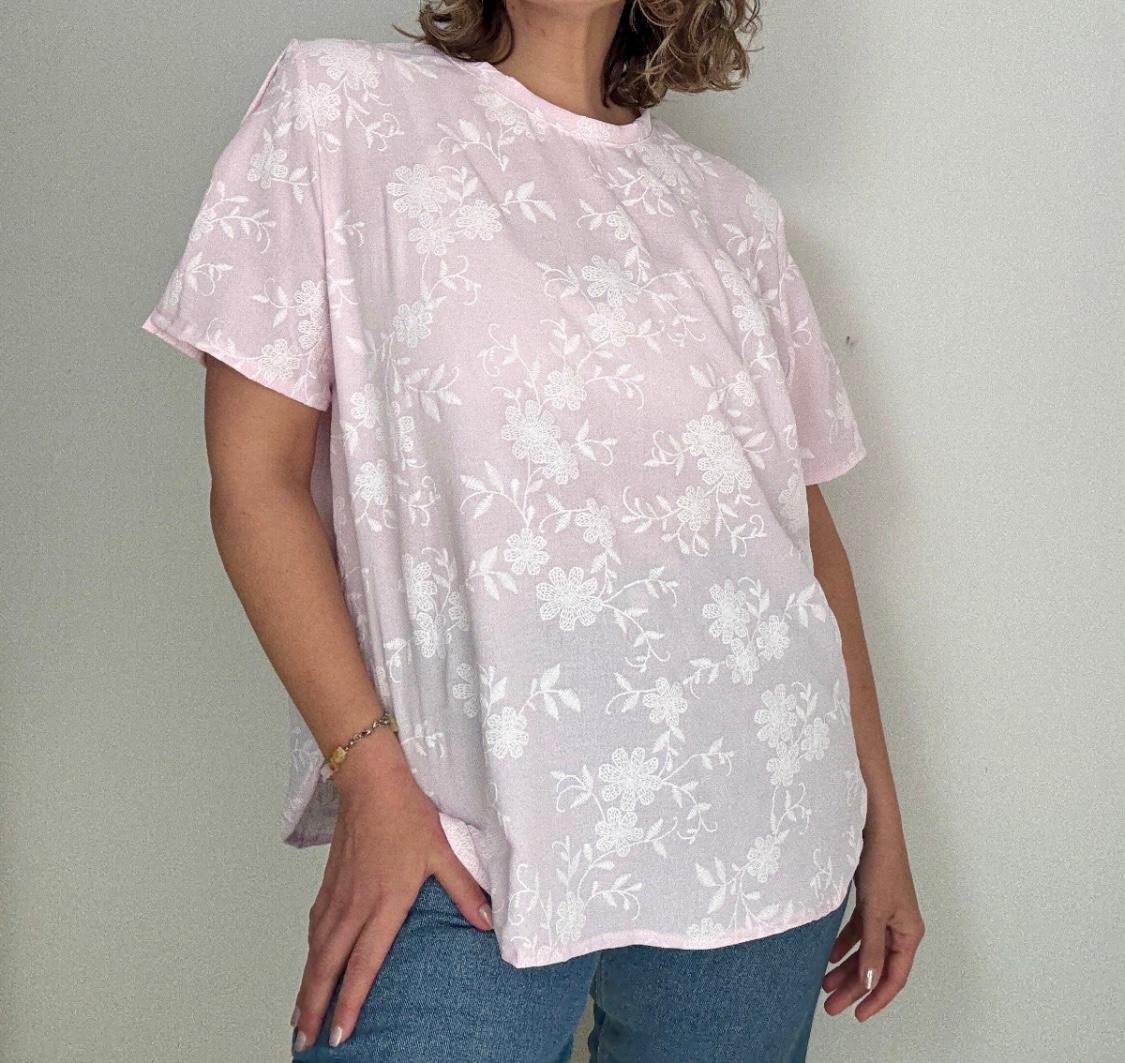 Blusa cuello redondo de ceil estampado, detalle de tajo en la manga corte evasé.
