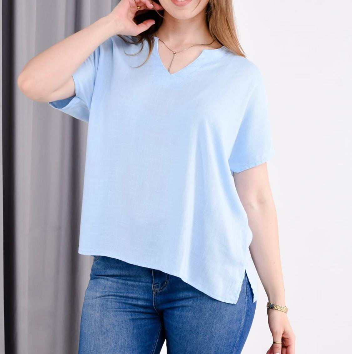 Camisola cuello mao de lino con spandex y tajos al costado. Talle unico abarca un XXL.