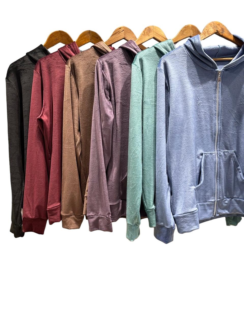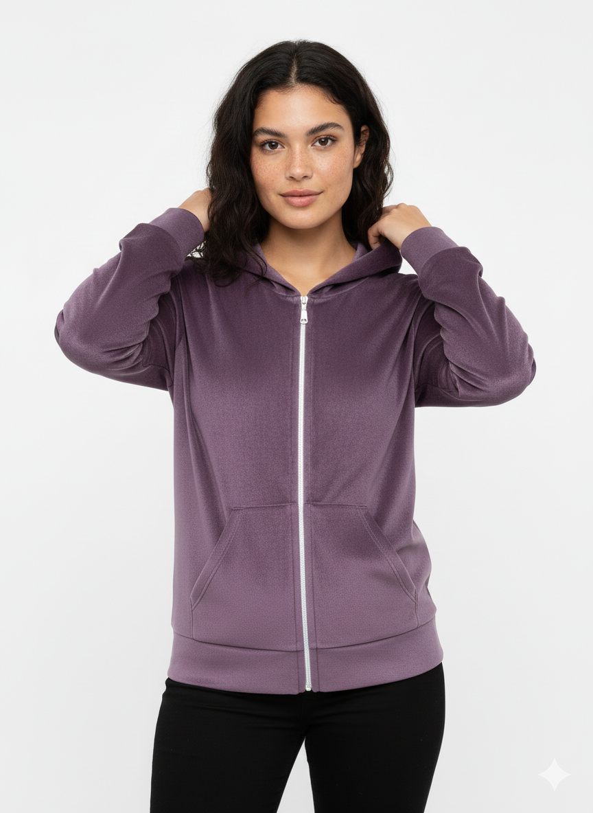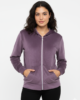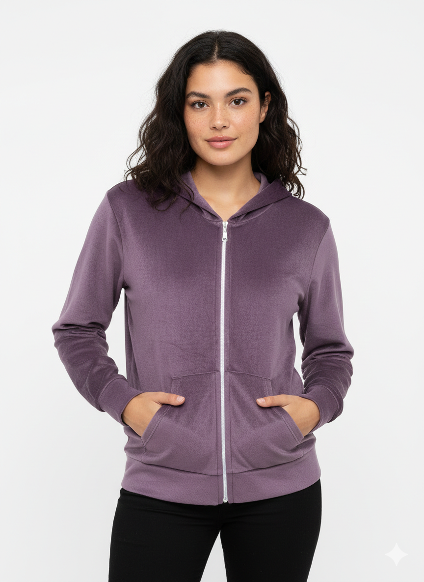 Campera de plush con bolsillos capucha, con cierre metálico.