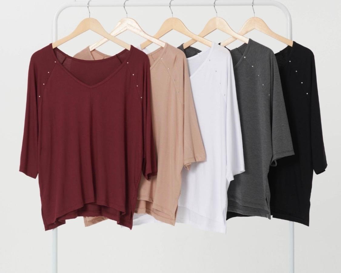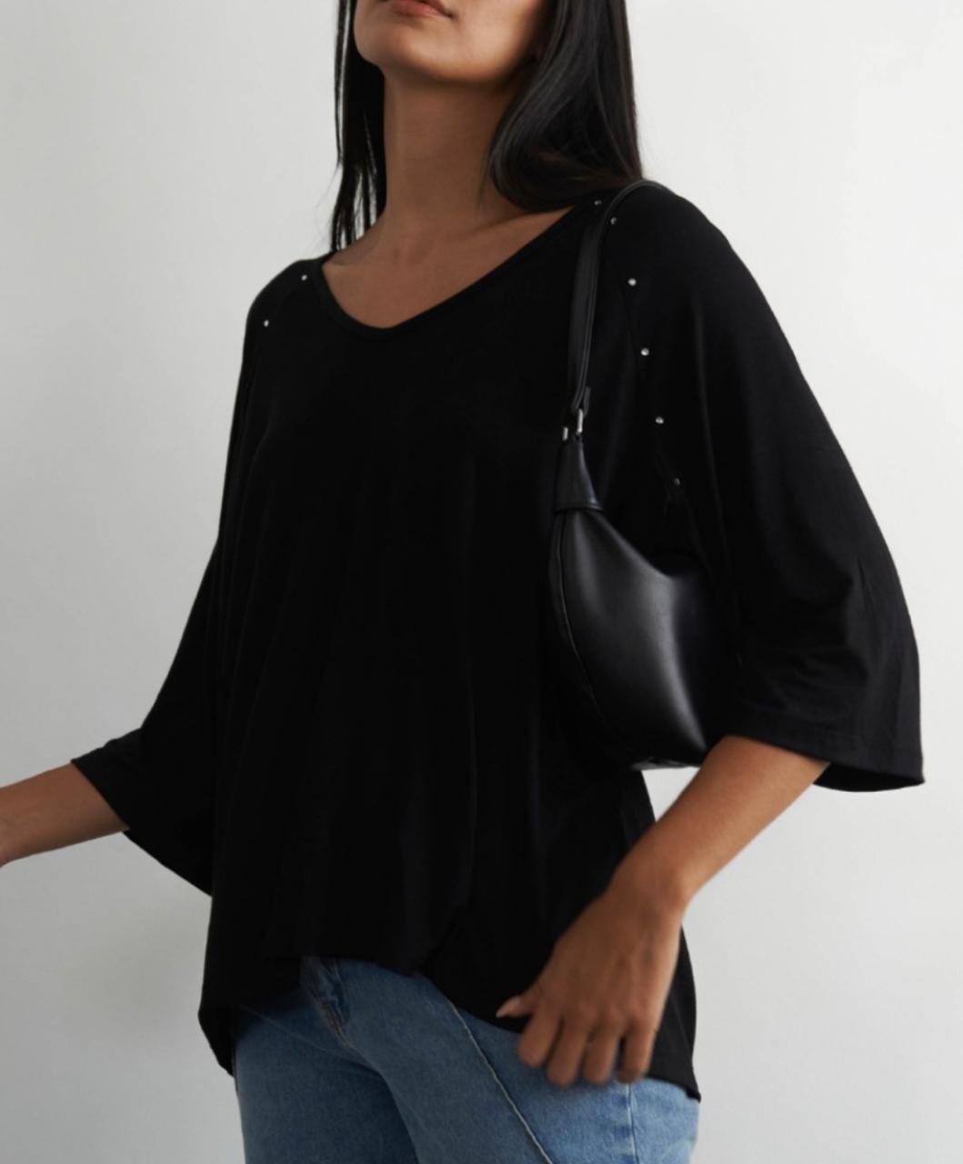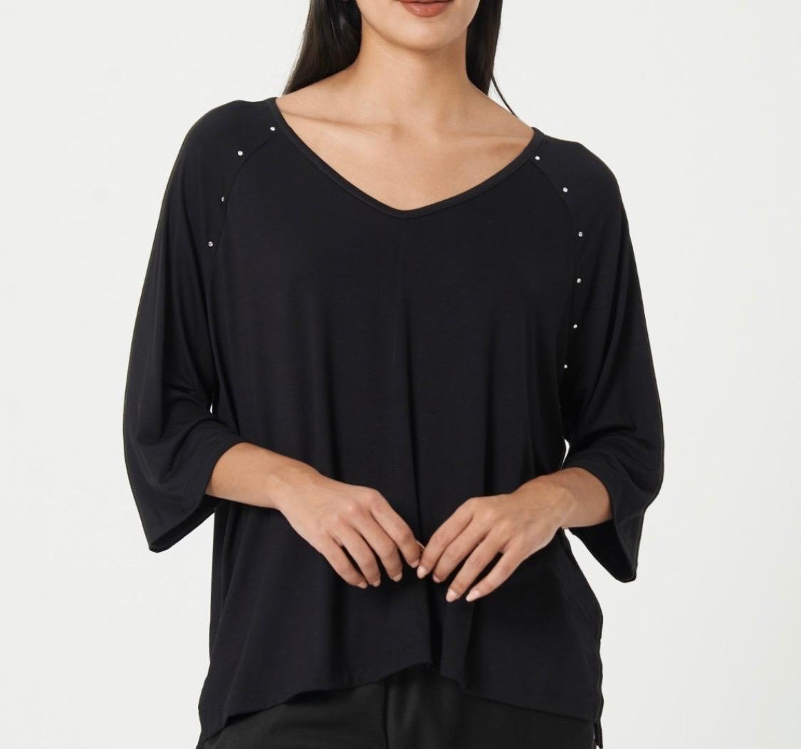 Remera de modal viscosa con tachas delanteras, escote en V. Talle unico equivale a XXL