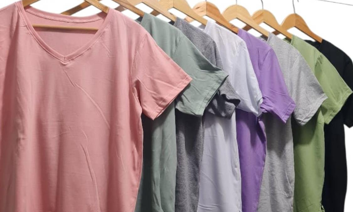 Remera basica de algodon escote en V, tiene tajos al costado.