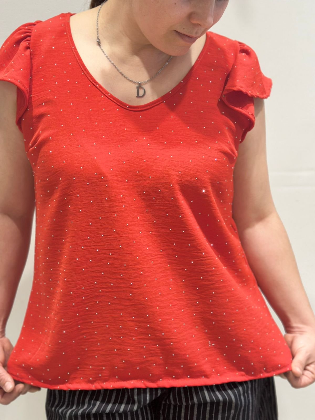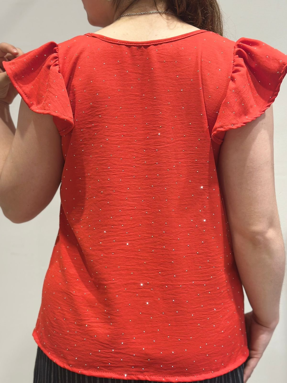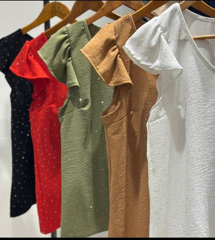 Remera de cey con glitter, volados en la manga, talle único oversize, abarca un XXL.