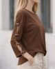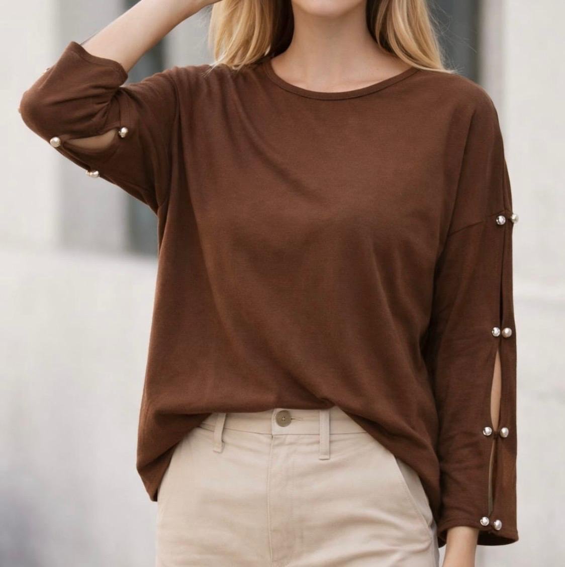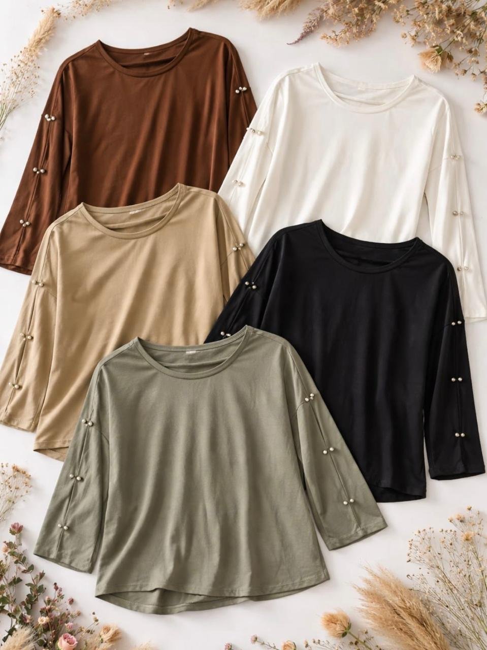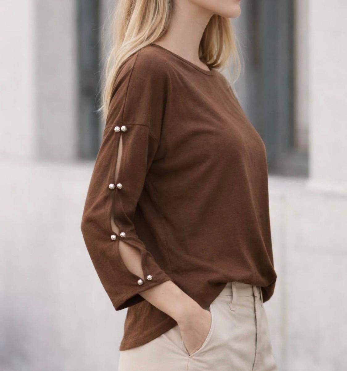 Remera manga 3/4 de algodón con perlas en la manga, talle único oversize equivale a XXL