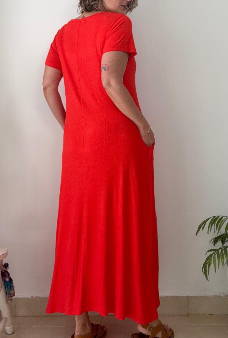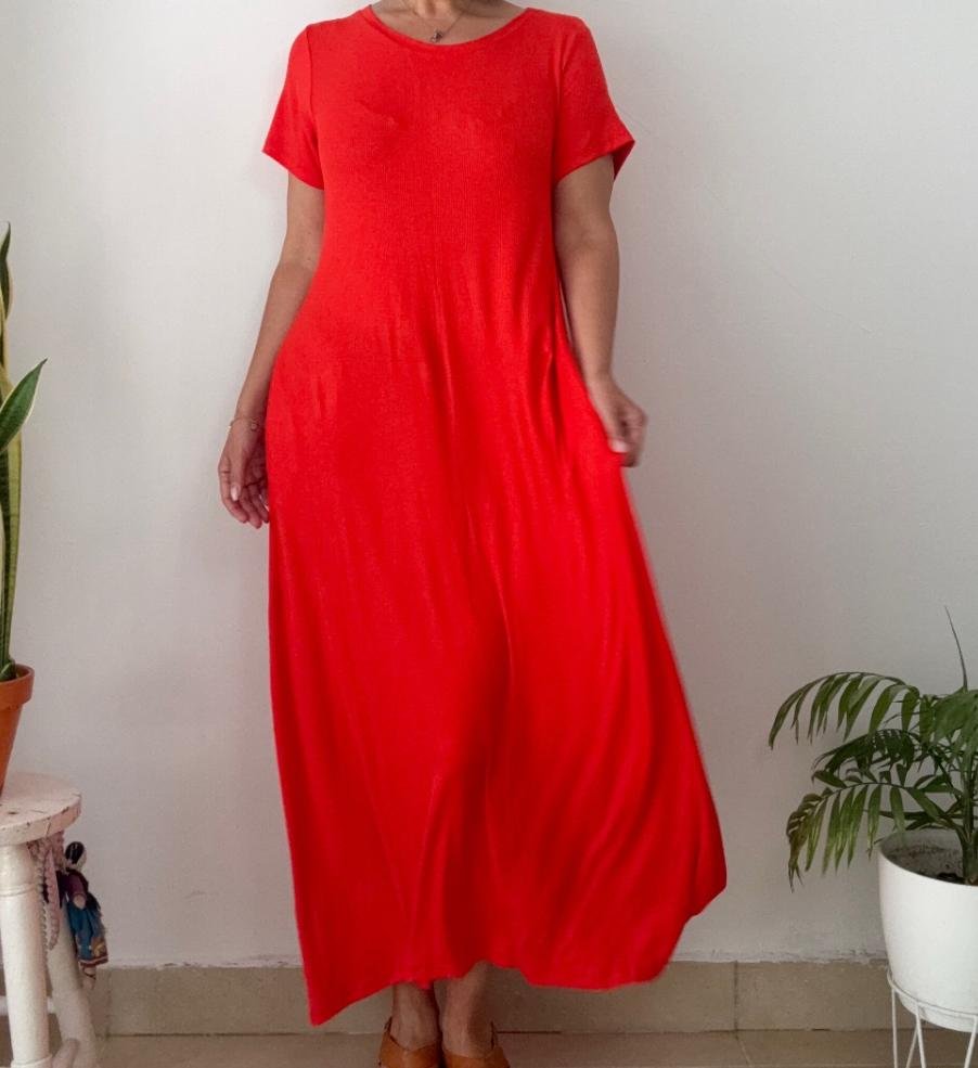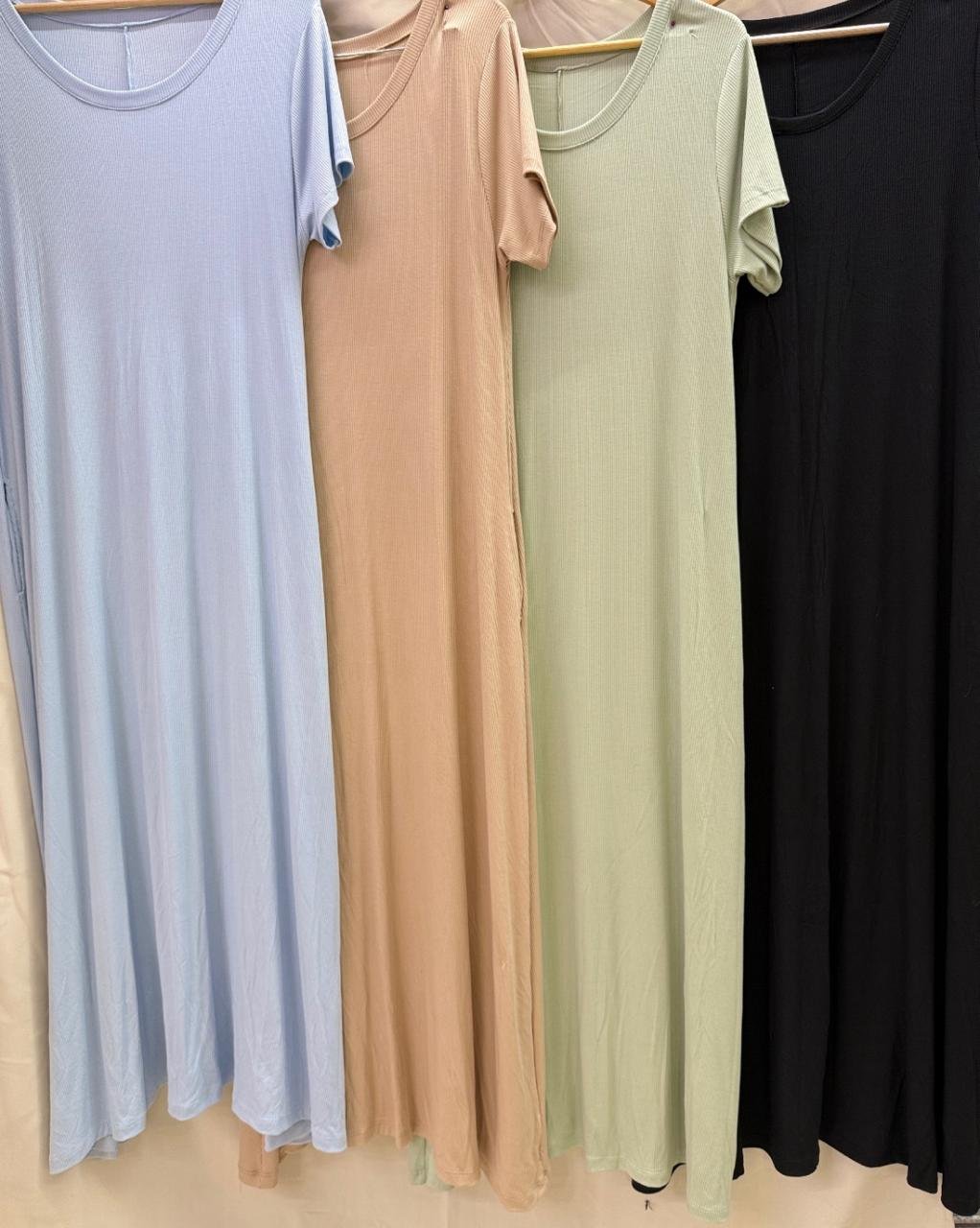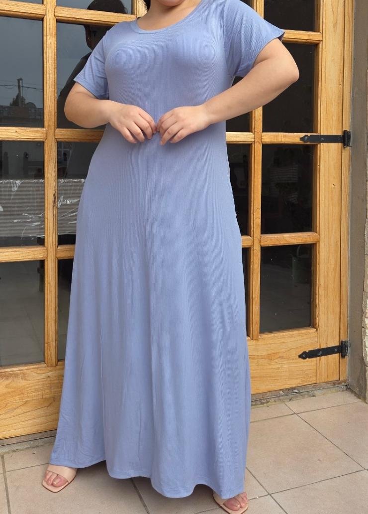 Maxi vestido de morley viscosa rib, cuello redondo, con bolsillos laterales. Viene en talle unico abarca hasta un talle 3XL real.