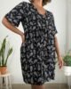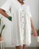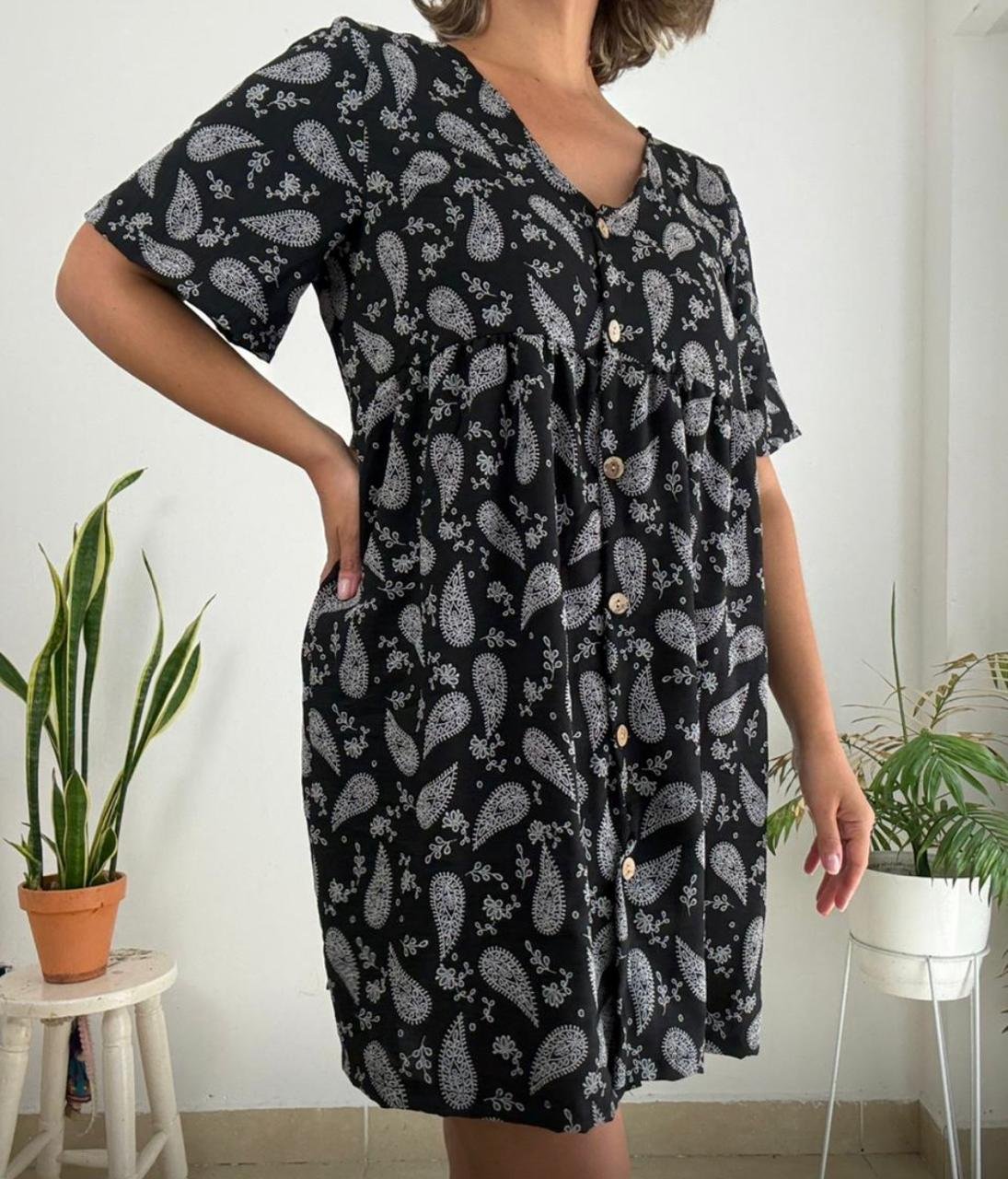 Vestido confeccionado en seda cey rutter simil bordado, escote en V. Talle único amplio que abarca un talle XXL real. Tiene botones de coco y bolsillos delanteros.